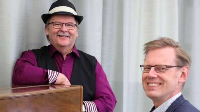 Yhteislauluja laulaja Martti Kuurilan ja pianisti Jussi Tammisen johdolla.