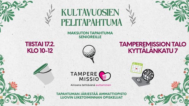 Tervetuloa Kultavuosien Pelitapahtumaan! Luvassa on monenlaista pelailua senioreille TampereMission uudella talolla! Bingoa, visoja, kahvitus!