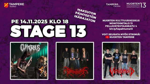 Marraskuun Stage 13 illassa pe 14.11. klo 18.00 alkaen lavalle nousevat nuoret metallibändit Cum Morbus, Dacryphilia ja Venomoid.